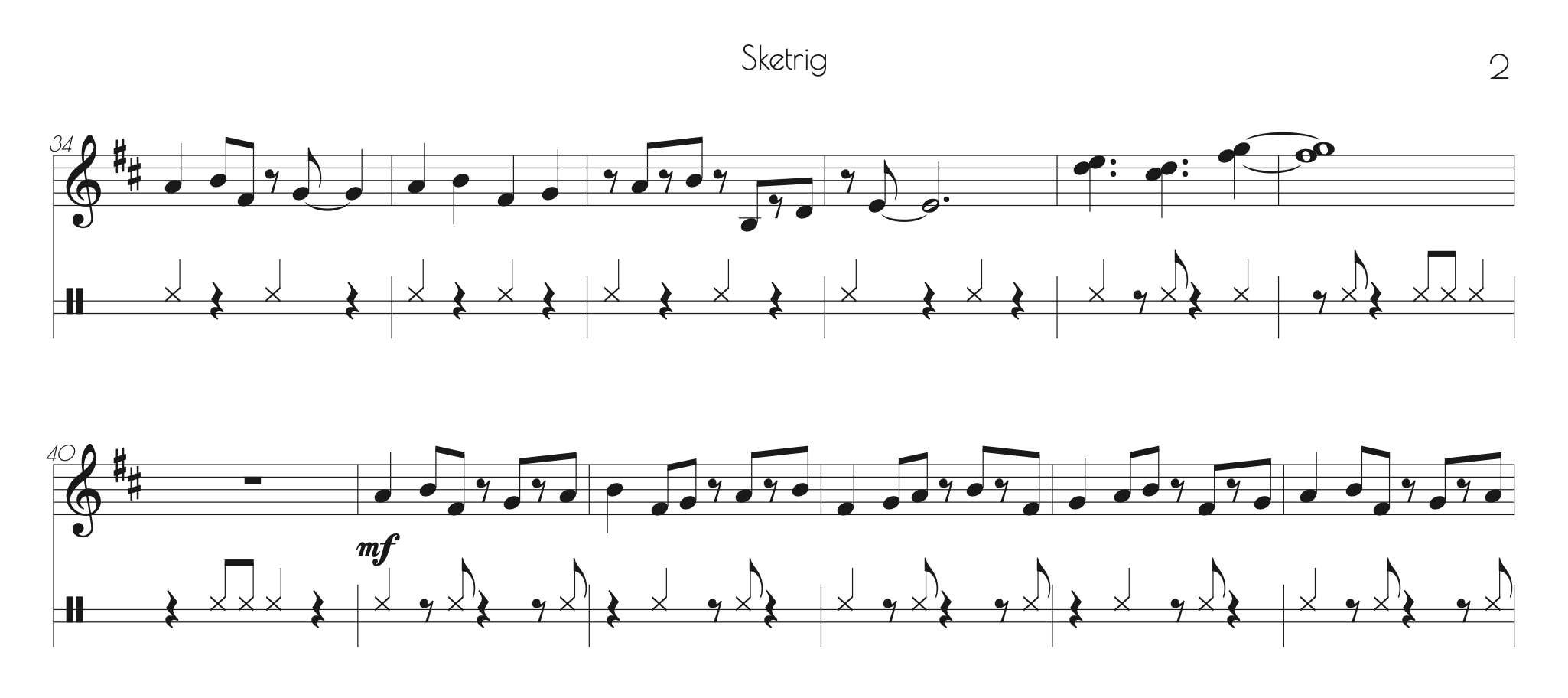 Sketrig is a percussion solo written for vibraphone, snare drum, and kick drum with live electronics. The piece draws upon popular music and contemporary percussion inspirations for an expansive sound environment created by electronics blending with the acoustic sound of the instruments. To promote accessibility, the piece utilizes relatively inexpensive technology with two contact microphones that are used in multiple ways.